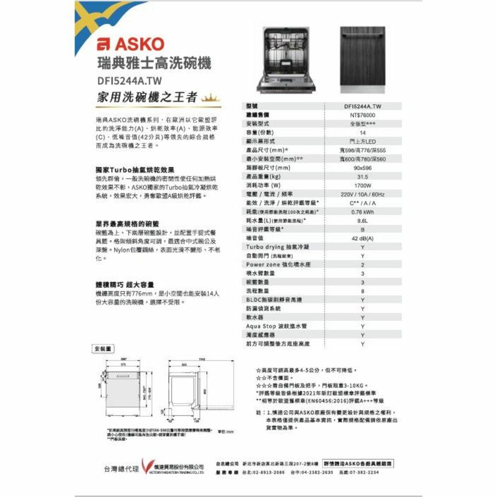 ASKO 賽寧家電 DFI5244A.TW 唯一可以調整高度 全嵌入式 洗碗機 220V 【KW廚房世界】