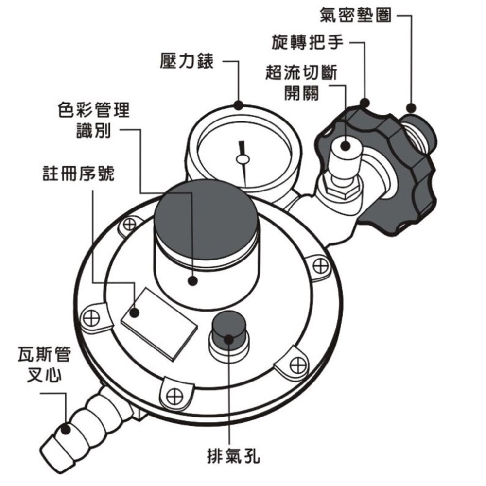 ✔️超流自動切斷-防止因橡膠管脫落、老化、破裂、老鼠咬破、燒毀而導致大量漏氣時調整器內部安全裝置自動關閉瓦斯,防止意外發生確保安全。