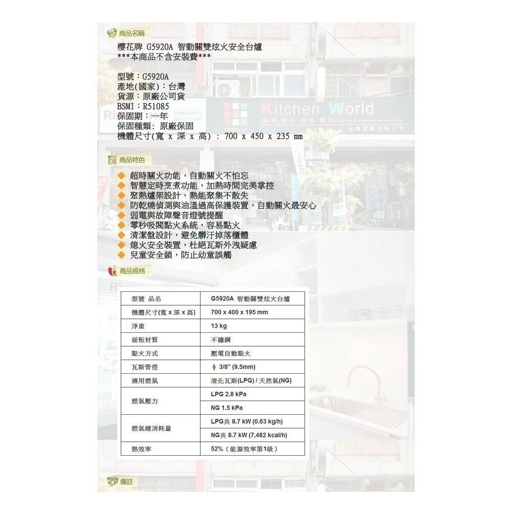 型號: 櫻花牌 G5920A 智動關 雙炫火 安全 台爐
