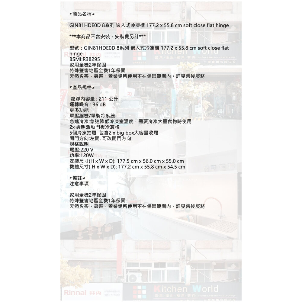 型號:BOSCH 博世 GIN81HDE0D 8系列 嵌入式冷凍櫃