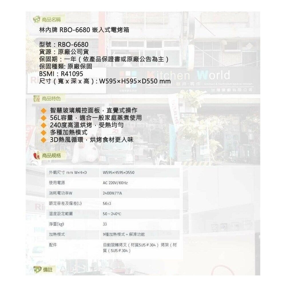 型號:林內牌 RBO-6680 嵌入式電烤箱