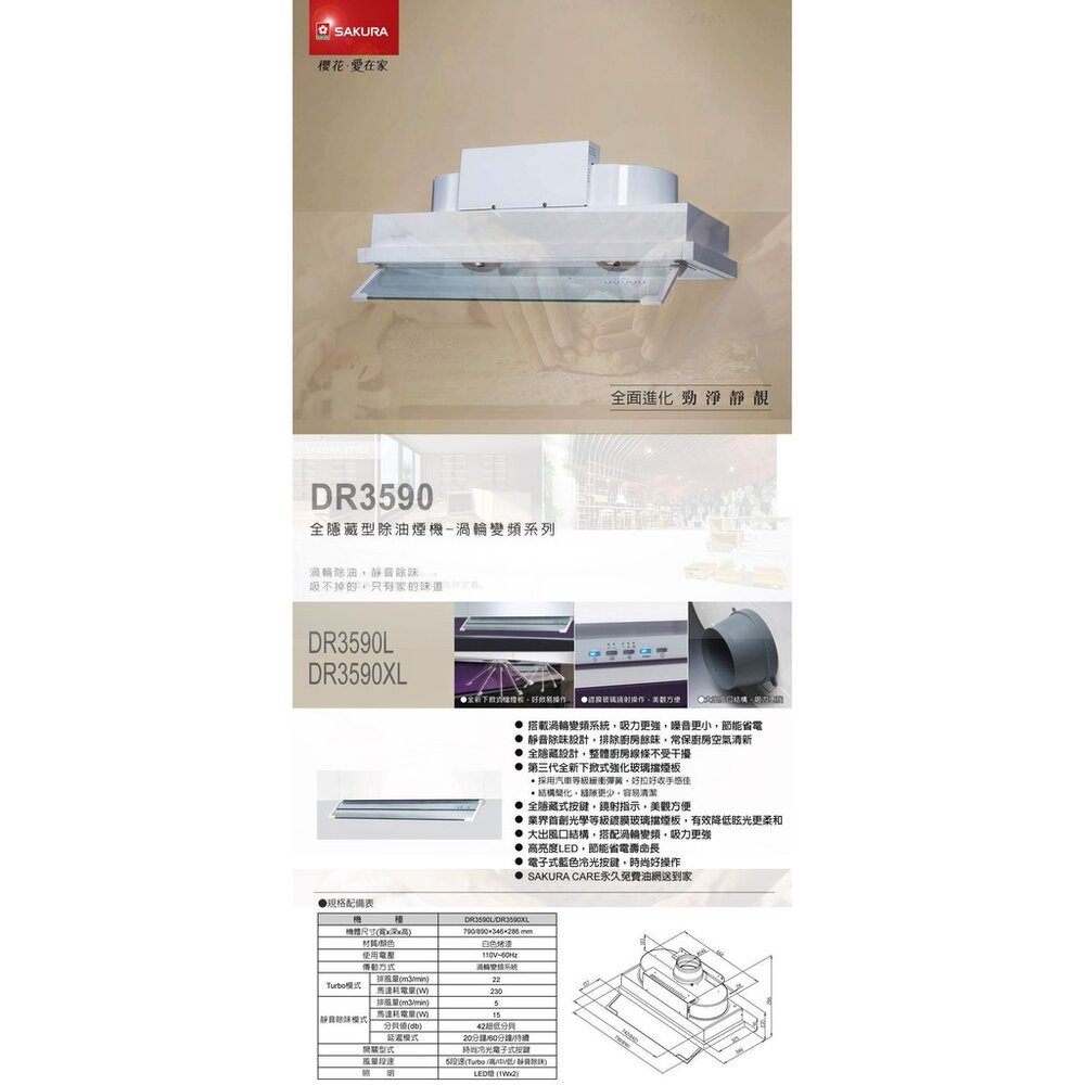 櫻花牌 DR3590AXL 全隱藏型除油煙機 渦輪變頻系列