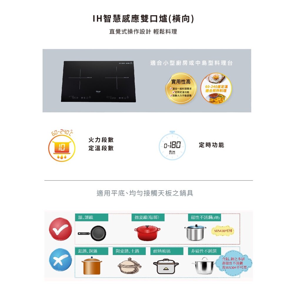 ◆ 左右爐口寬幅加熱區,實用性高,適合一般料理需求