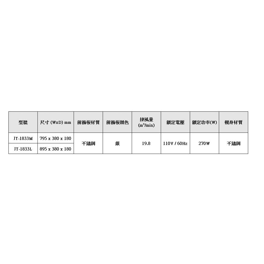 喜特麗 JT-1833M JT-1833L 隱藏式排油煙機