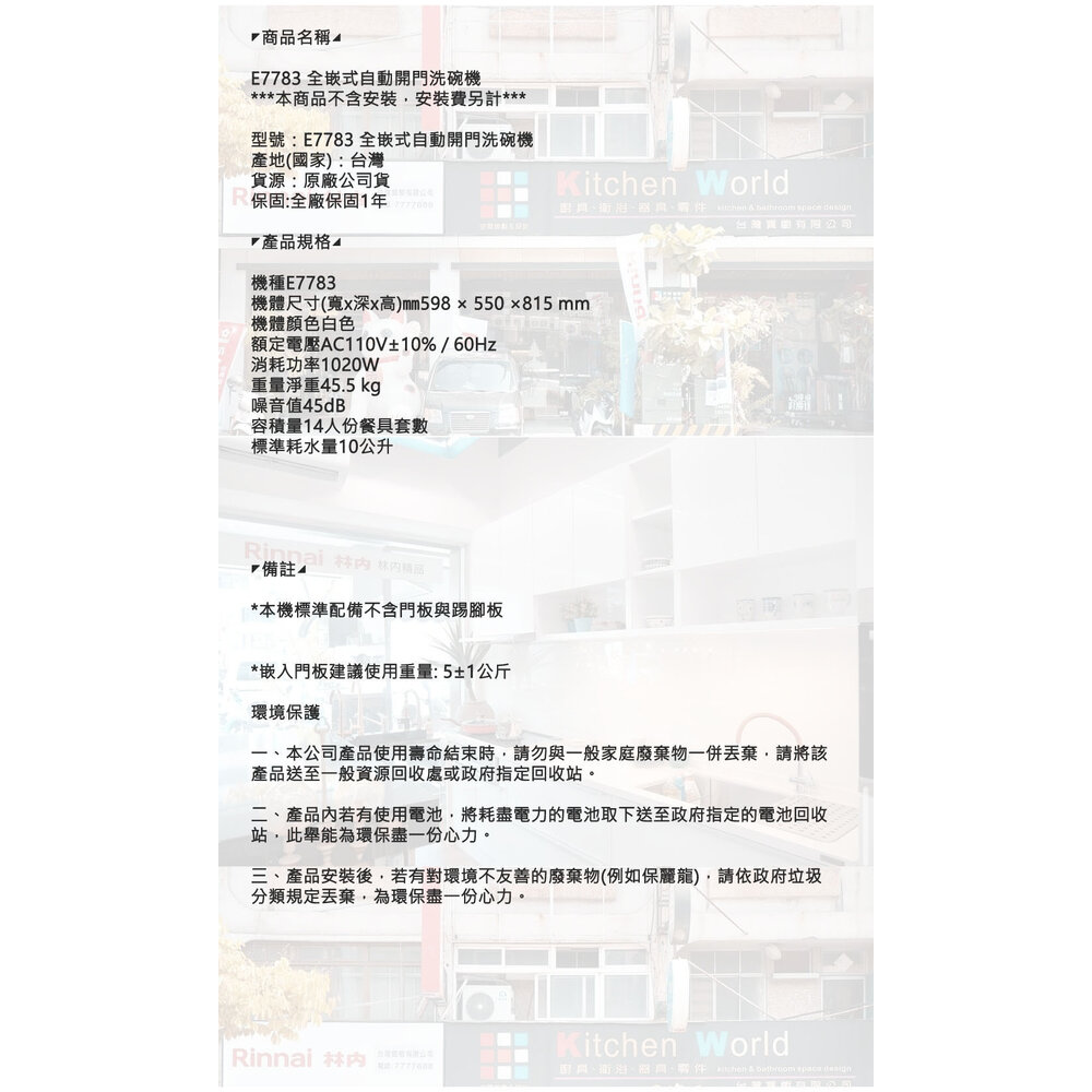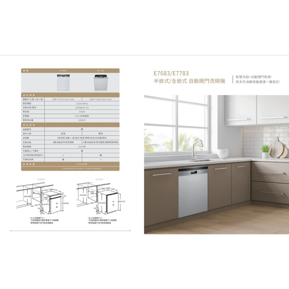 型號: 櫻花牌 E7783 全嵌式自動開門洗碗機