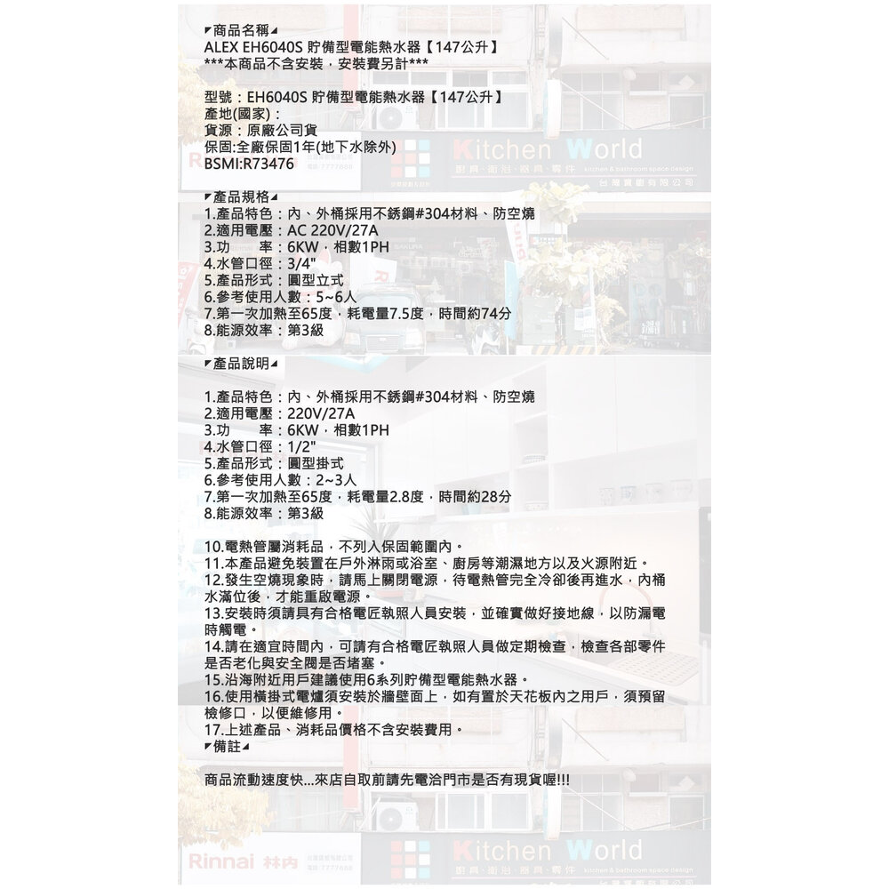 高雄 ALEX 電光舒活 EH6040S 貯備型電能熱水器 電熱水器【147公升】 封面照片