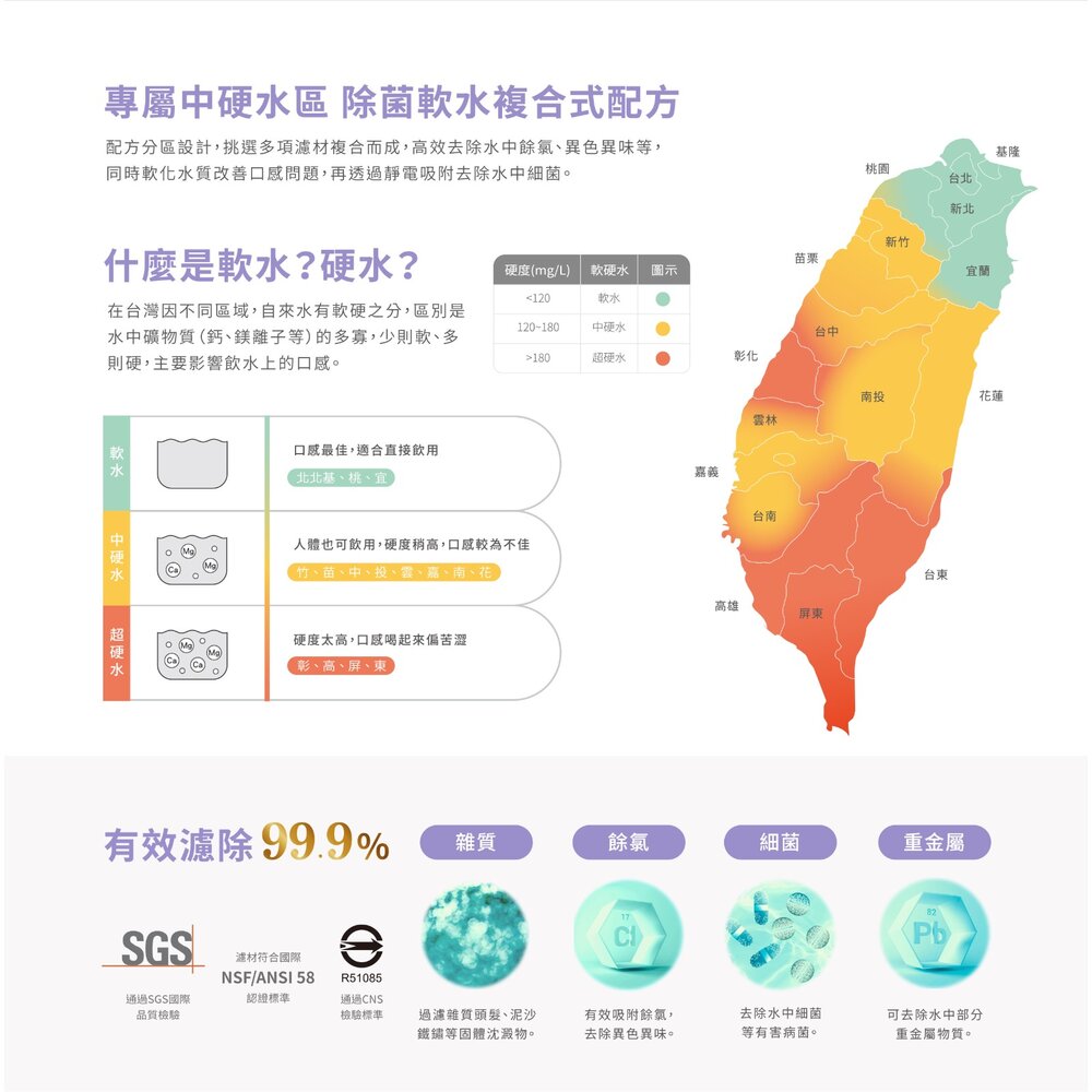 第一道濾心(建議更換週期):活性碳+氫鈉樹脂+天然礦物纖維 (6~8個月)