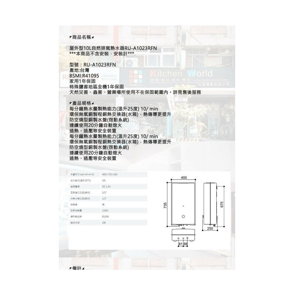 林內牌 RU-A1023RFN 屋外型10L 熱水器 自然排氣