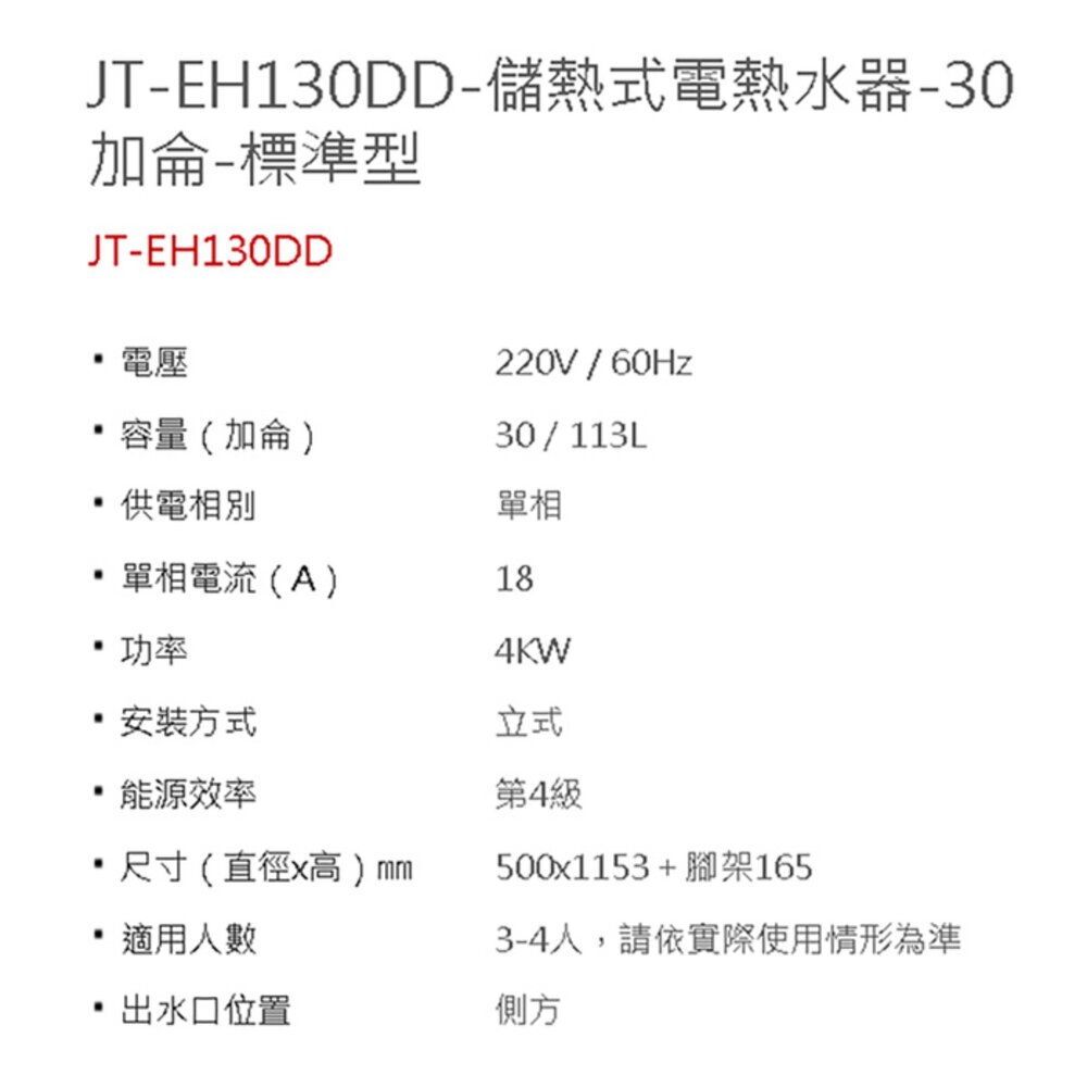 【喜特麗】JT-EH130DD 30加侖 儲熱式電熱水器 (標準型)