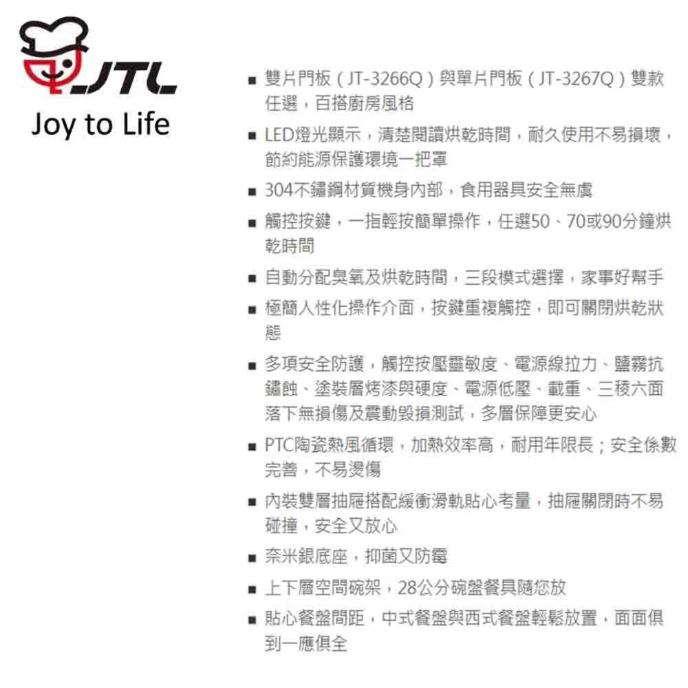 型號: 喜特麗 JT-3267Q 全平面觸控落地 下嵌式烘碗機