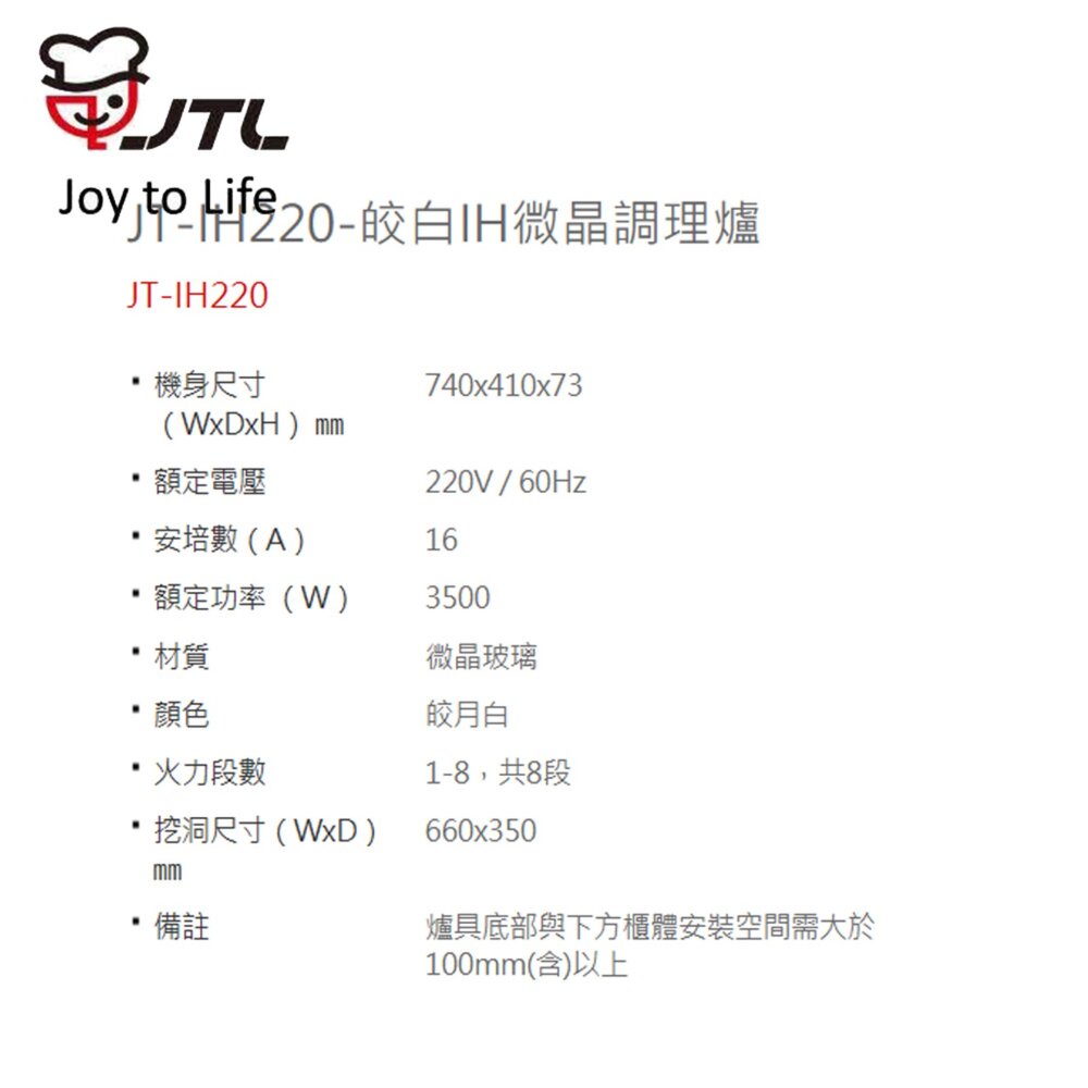 型號:JT-IH220 皎白IH微晶調理爐