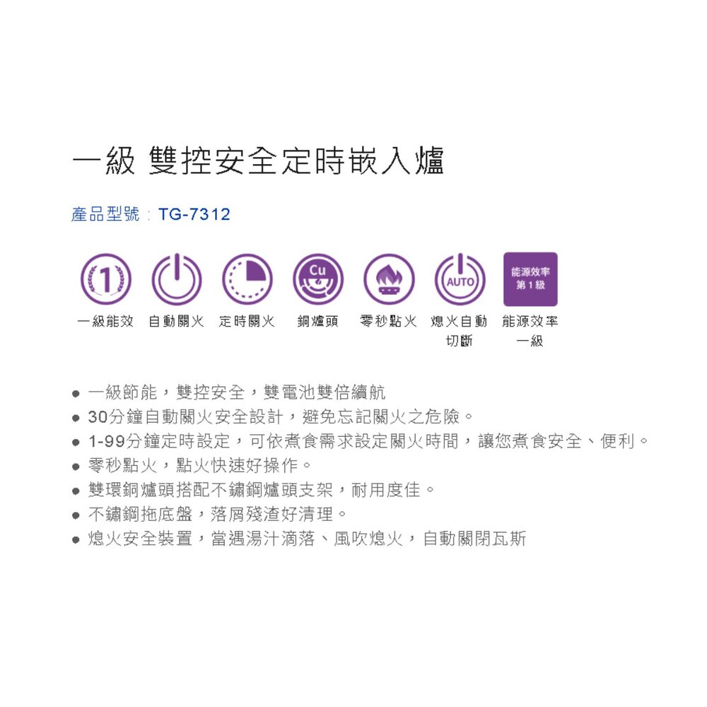 莊頭北 TG-7312 雙控安全定時嵌入爐
