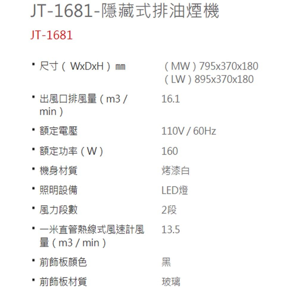 喜特麗 JT-1681 隱藏式排油煙機 抽油煙機