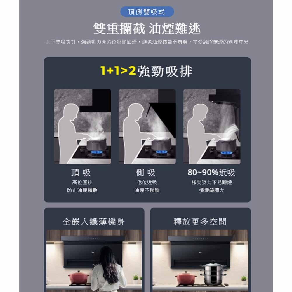 • 頂側雙吸式 : 上下雙吸設計,全方位強勁吸排油煙