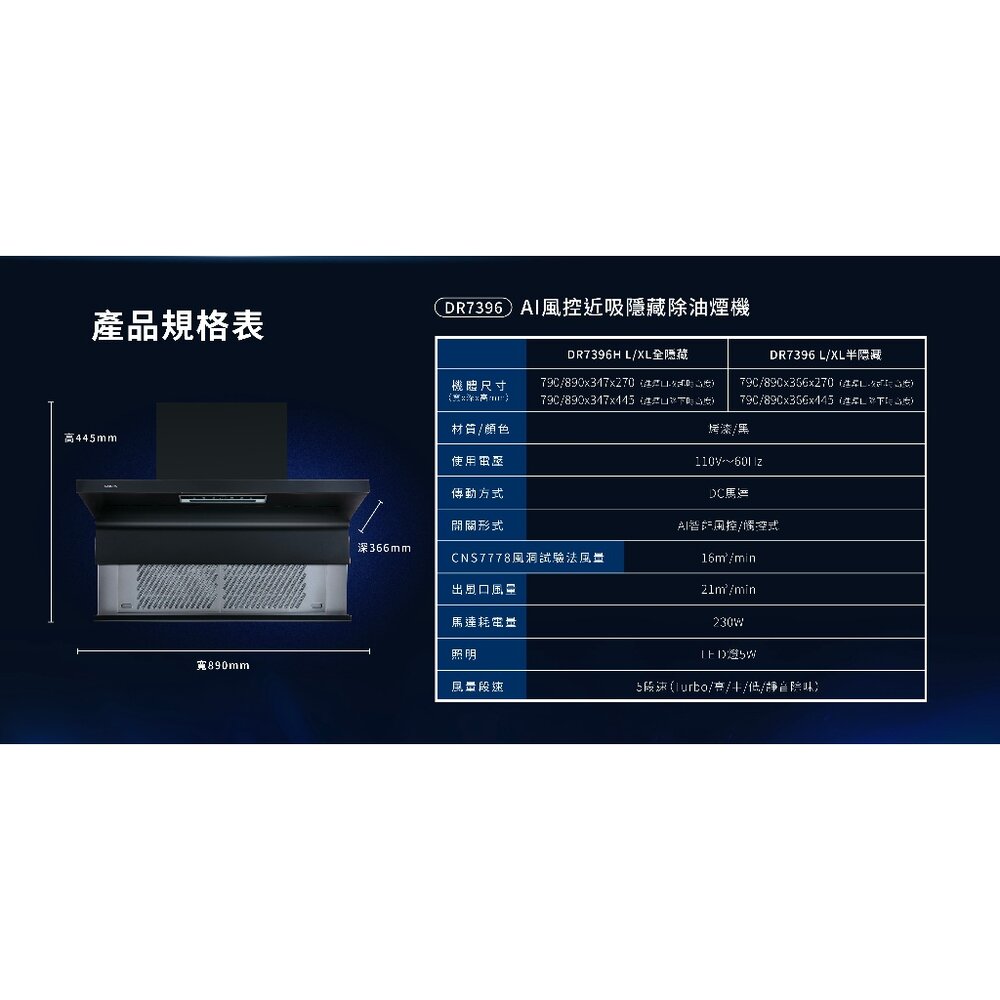 櫻花牌 DR7396 近吸除油煙機- 渦輪變頻 AI風控系列