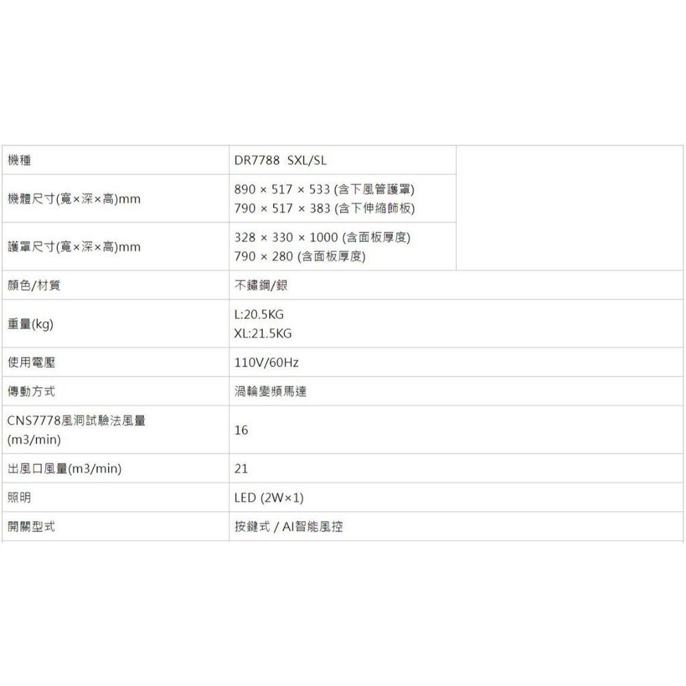 •DR7788 SL: 790x280(含面板厚度) *補充說明: 本機型790mm尺寸不含風管護罩,可依環境需求,選購風管護罩