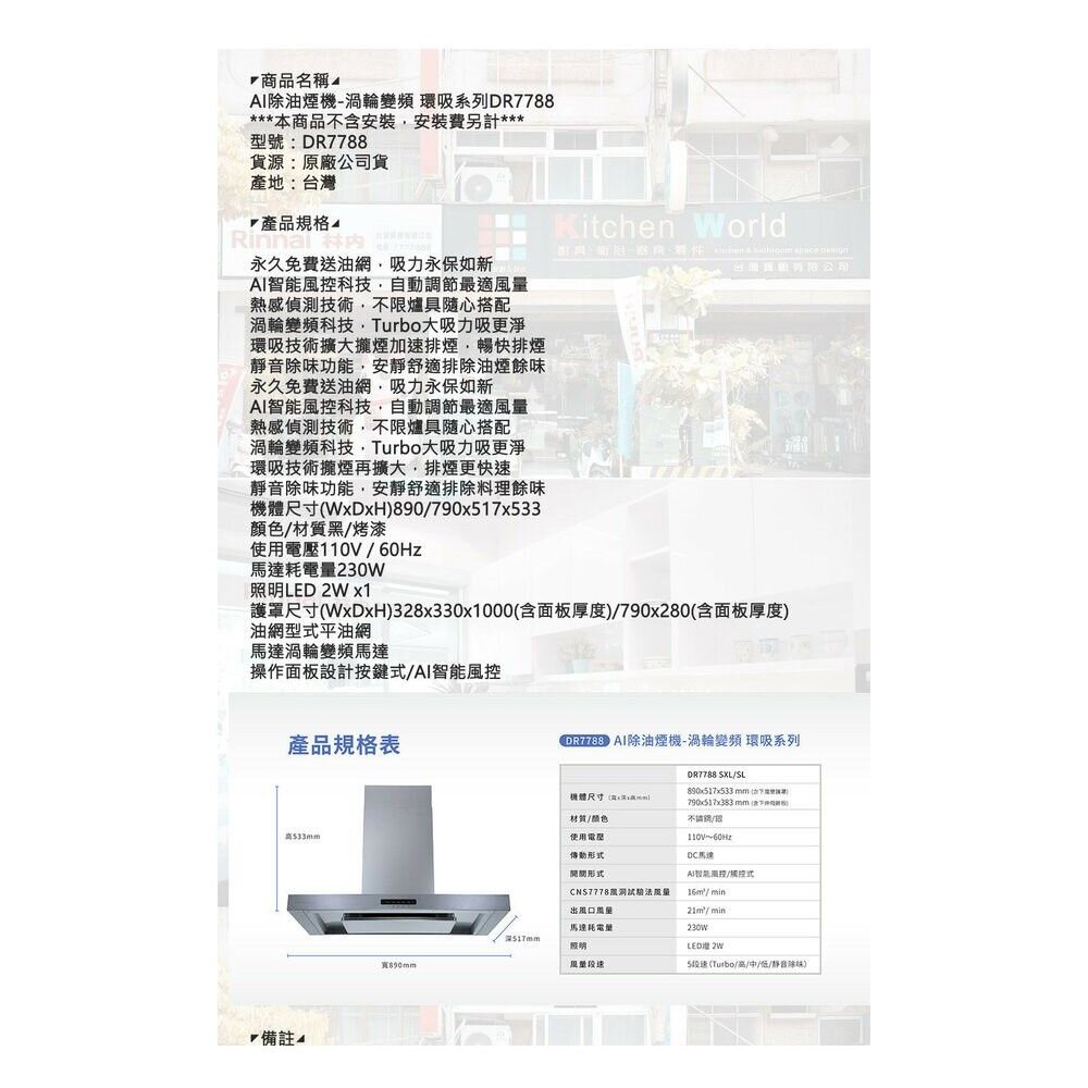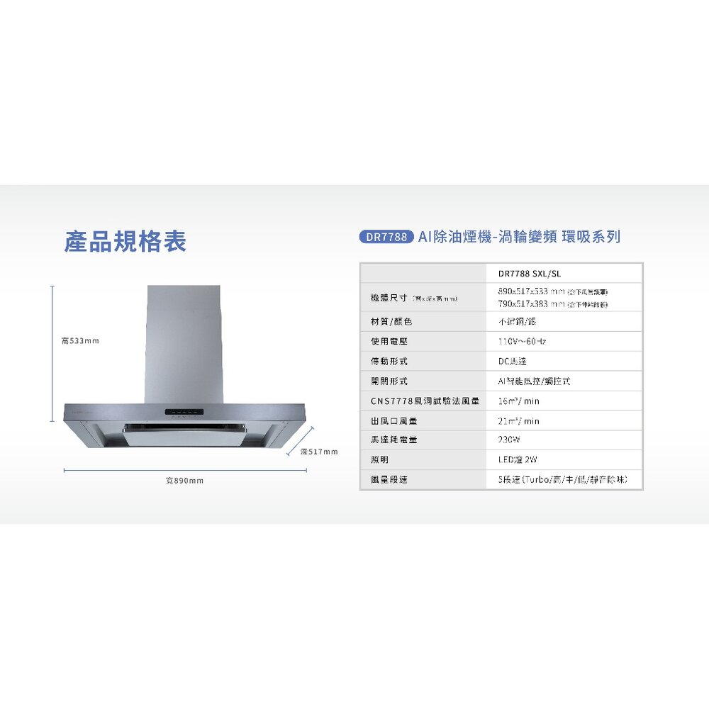櫻花牌 AI除油煙機 DR7788 渦輪變頻環吸系列 智能排油煙機