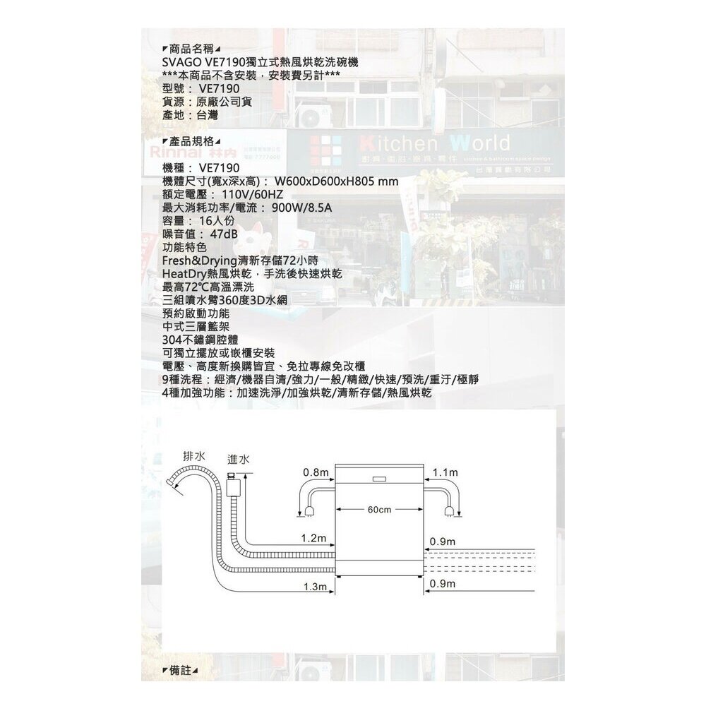 型號:SVAGO VE7190 獨立式熱風烘乾 洗碗機 獨立烘碗機