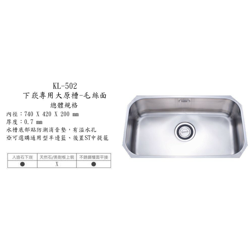 大吉熊 KL-502 不鏽鋼 水槽 大原槽-毛絲面(有溢)