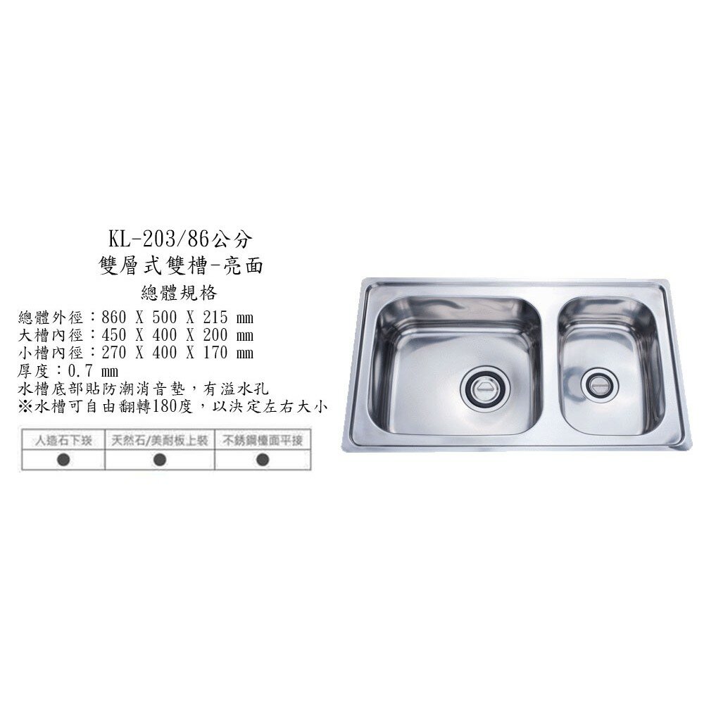 大吉熊 KL-203 不鏽鋼 水槽 雙層式雙槽-亮面 86公分